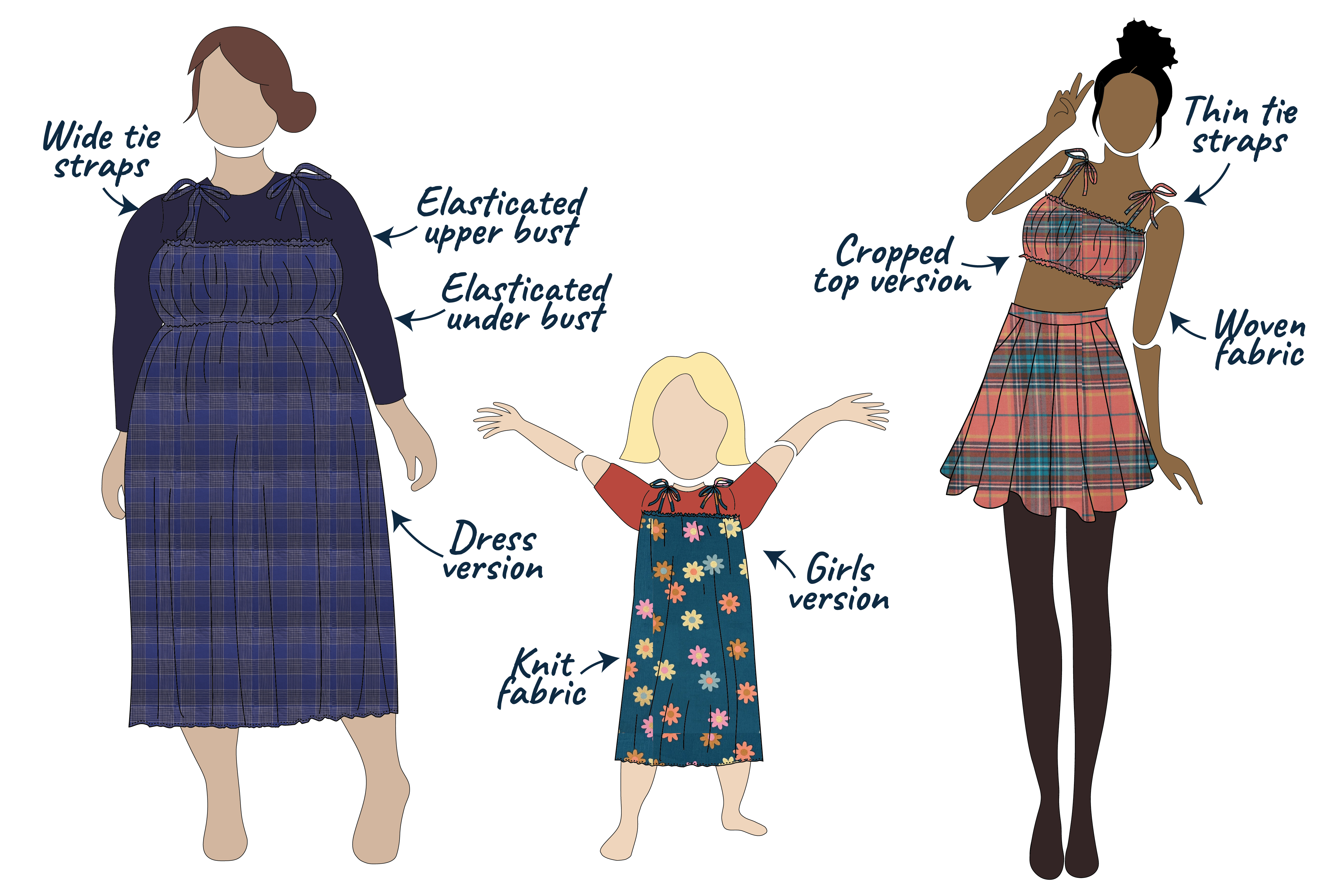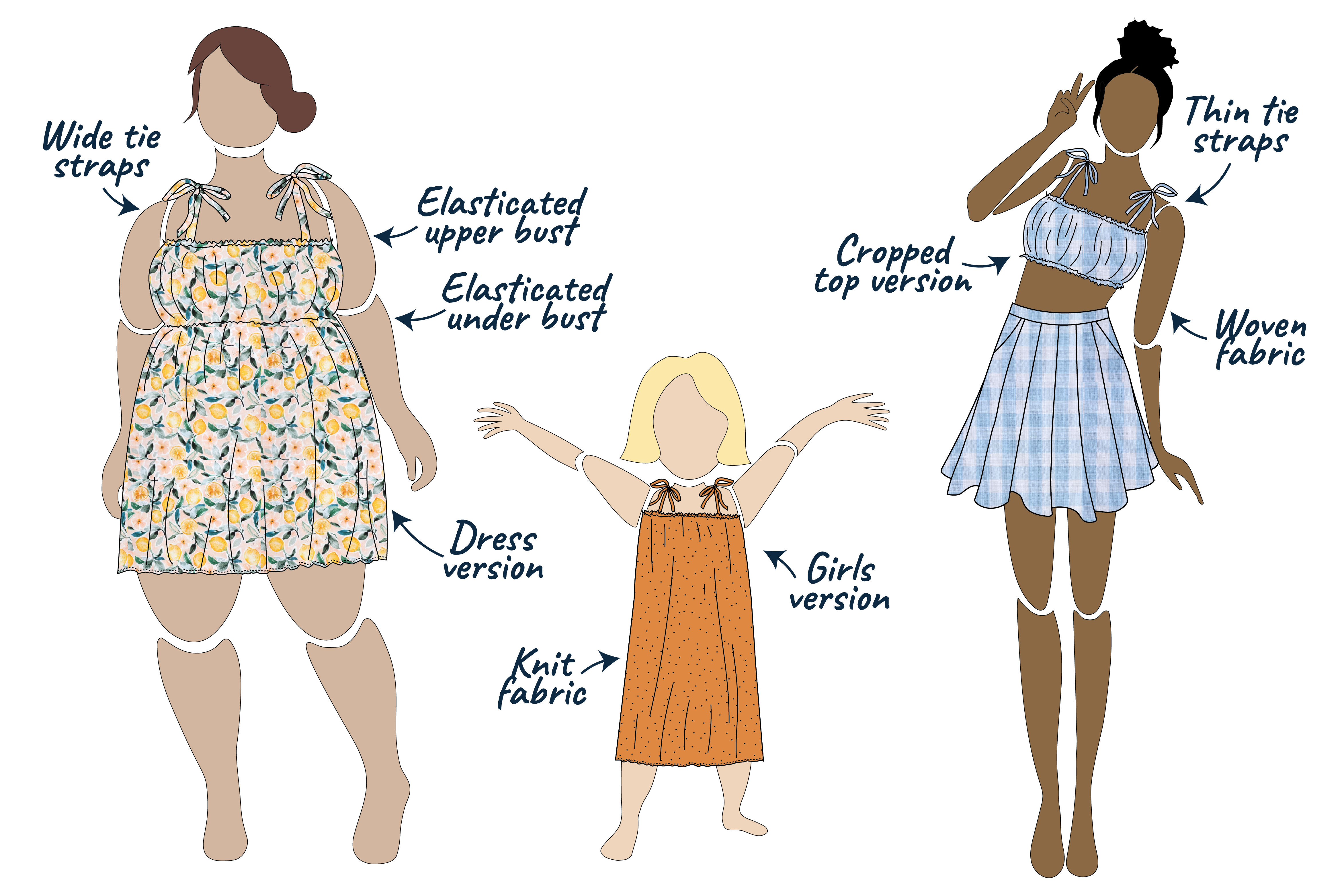 Isla features elastic around the high bust, plus an optional elastic channel at the waist or under bust if you want to add a little shape. All versions include tie straps for a pretty finish, but they’re totally optional if you're dreaming up strapless dress.