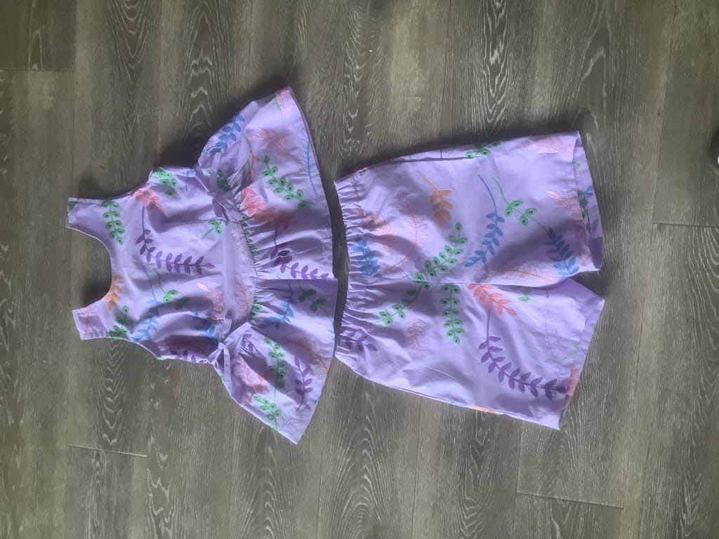 The front bodice has little waist darts and side ties that let you bring in some shape without losing any of that comfy, relaxed fit kids love. The back bodice features a flat-felled seam for a neat finish, and the neckline and armholes (for the sleeveless version) use bias binding, which gives everything a clean, polished look.
