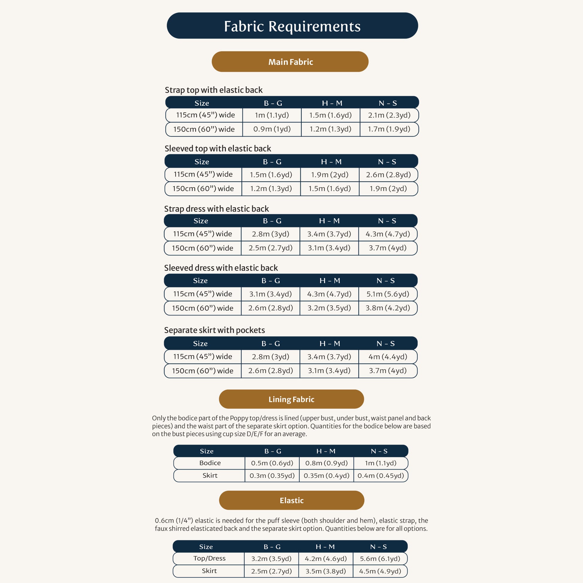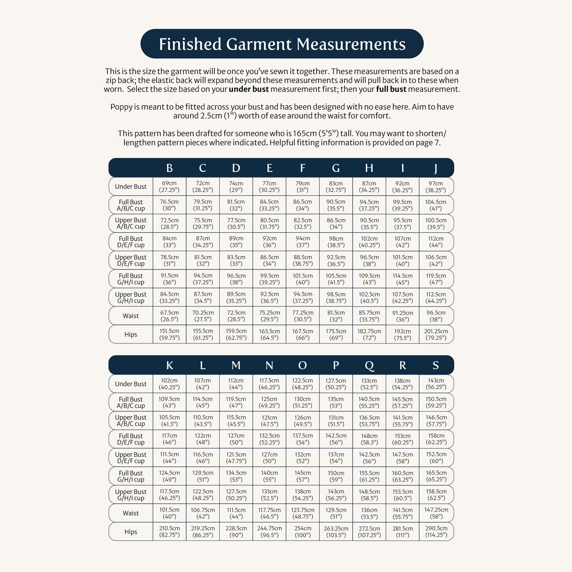 For the perfect fit, Poppy includes three different cup size options (up to a cup size I), and you can choose between an invisible zip closure or an elasticated faux shirring back for a flexible, custom feel. There is a comprehensive 9 page fitting guide with step-by-step instructions on getting the best fit around your bust and waist!