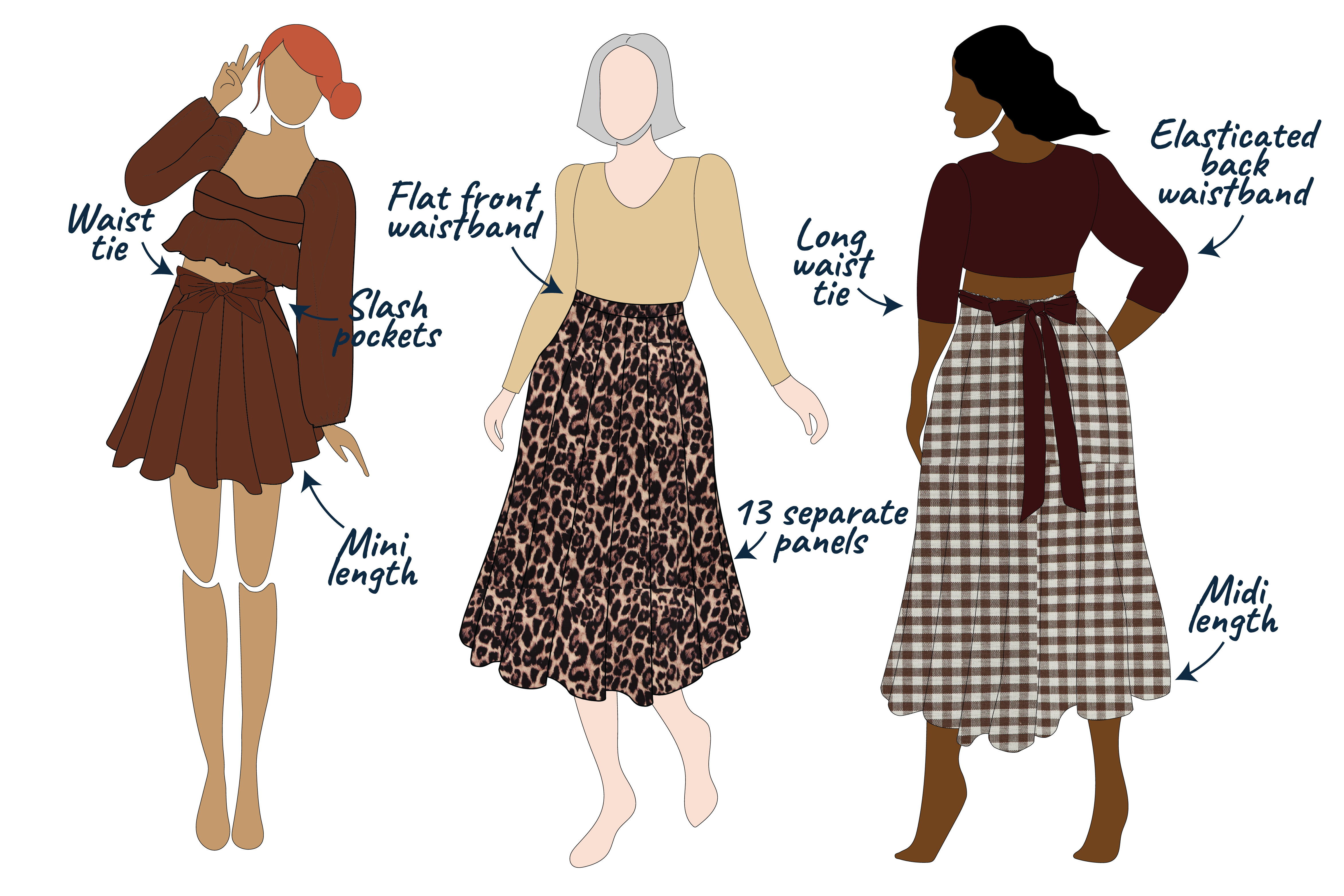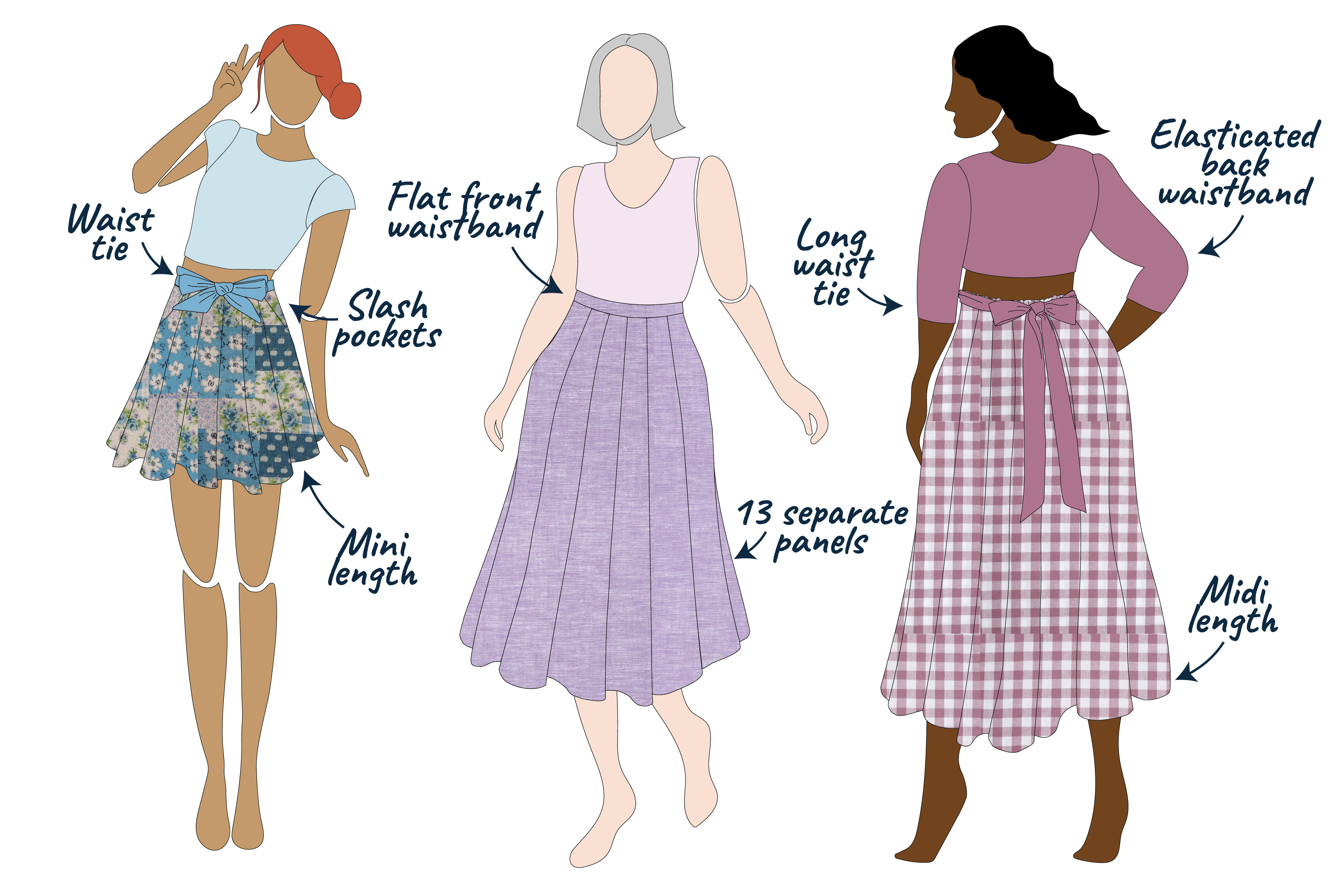 You can make Sylvie as a cute mini skirt or a swooshy midi skirt, and you get to decide if you want slash pockets or a waist tie for a statement bow moment. The whole skirt is made from panels so you can use up your fabric scraps, mix prints, play with colour blocking… honestly, it’s a scrap-busting dream!